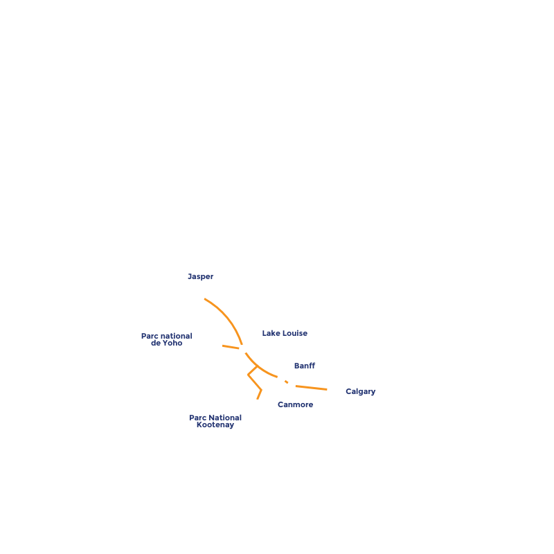 Parcours de la célèbre route des glaciers en direction de Jasper. Chaque arrêt révèle des panoramas saisissants : glaciers étincelants, cascades puissantes et vallées majestueuses. C’est l’une des routes les plus mythiques du pays, offrant une immersion totale dans la grandeur des Rocheuses.